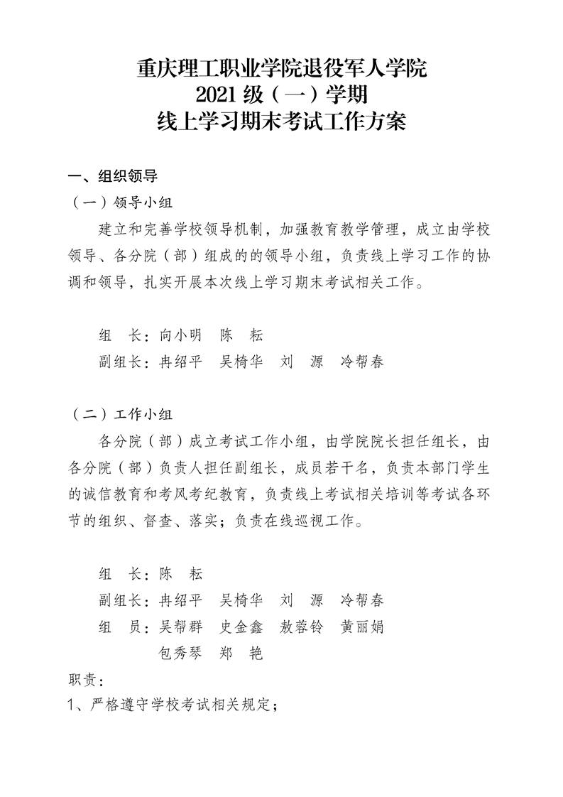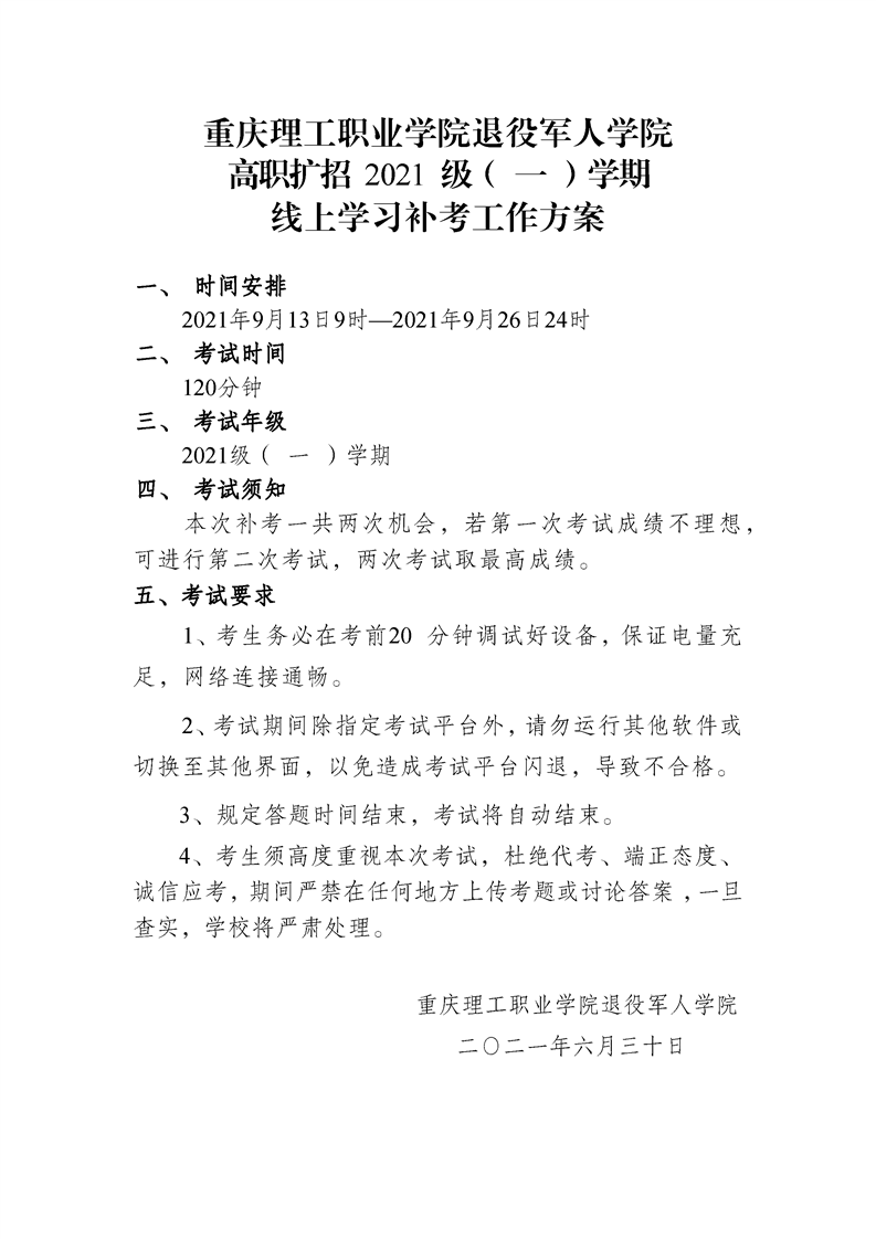 退役军人教育学院2021 级(一)学期 线上学习期末考试工作方案及补考工作方案