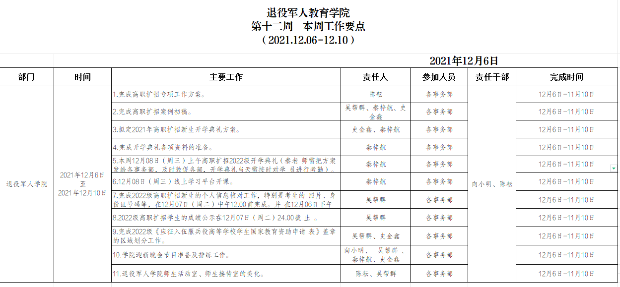 退役军人学院2021.12.6-12.10工作要点