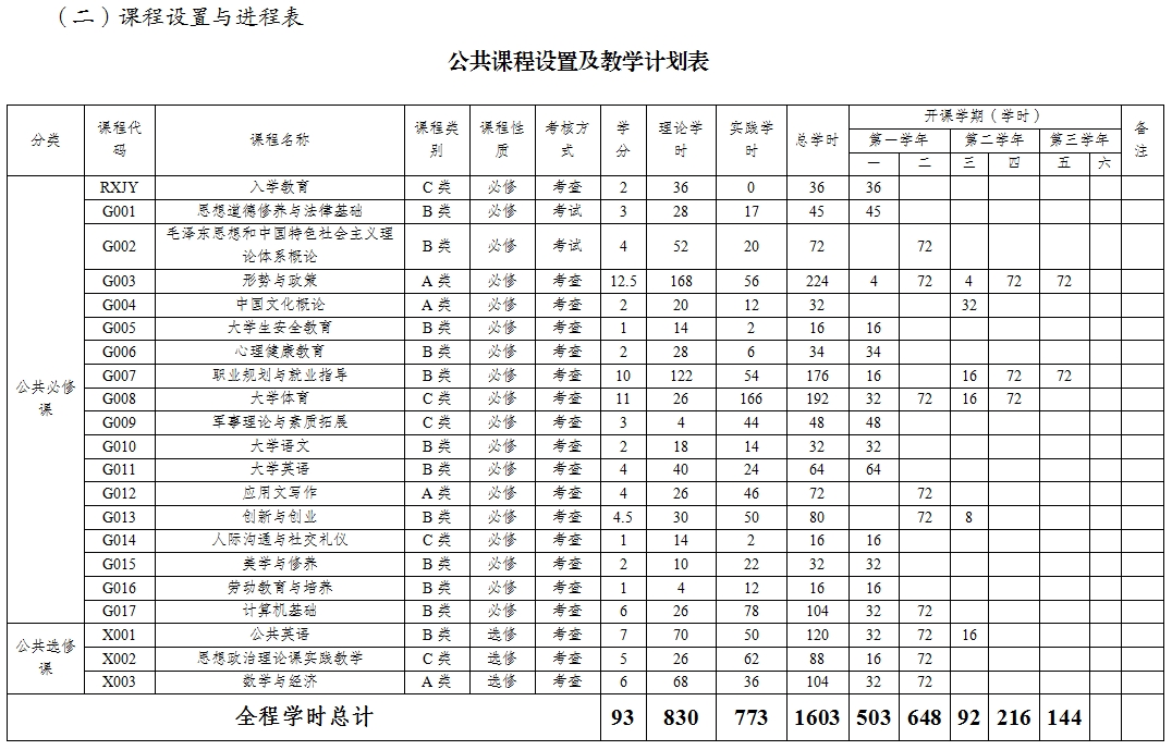 公共基础课程包含思政及心理素质、审美与艺术素质、国防军训及身体素质、人生规划与就业指导、数学与经济素质、英语交流与应用、社交礼仪及人际沟通、写作及现代化办公、劳动及创新创业等课程。