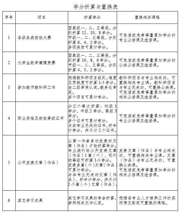 学生在校学习期间,参加各级各类技能竞赛并获奖、参与教师教科研工作、考取专业相关的职业资格及技能等级证书、公开发表文章(作品)等,均给予学分奖励,并折算成相关课程学分,可免修或免考相关课程。学分折算与置换关系如下表所示。