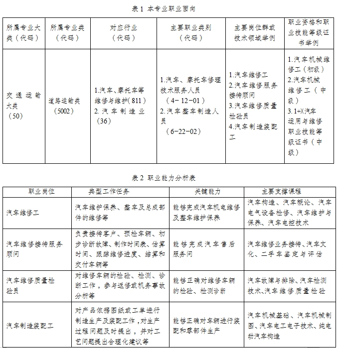 本专业培养理想信念坚定,德、智、体、美、劳全面发展,具有良好的人文素养、职业道德和创新意识,精益求精的工匠精神,较强的就业能力和可持续发展的能力;掌握对汽车进行性能评价和试验的能力,诊断和排除汽车常见故障的能力及汽车总成及零部件维修、检验的基本能力,面向汽车制造行业的装配及零件制造等职业群,以及汽车维修行业的机电维修工等职业群(或技术技能领域),能够胜任汽车制造、汽车故障诊断与排除、汽车维修、汽车整形修复、汽车涂装能力和汽车美容方案设计、二手车鉴定、事故车定损等工作,适应产业转型升级和企业技术创新需要的发展型、复合型、创新型的高素质技术技能人才。
