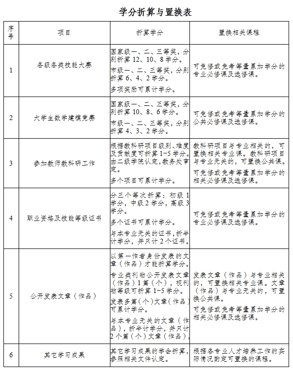 学生在校学习期间,参加各级各类技能竞赛并获奖、参与教师教科研工作、考取专业相关的职业资格及技能等级证书、公开发表文章(作品)等,均给予学分奖励,并折算成相关课程学分,可免修或免考相关课程。学分折算与置换关系如下表所示。