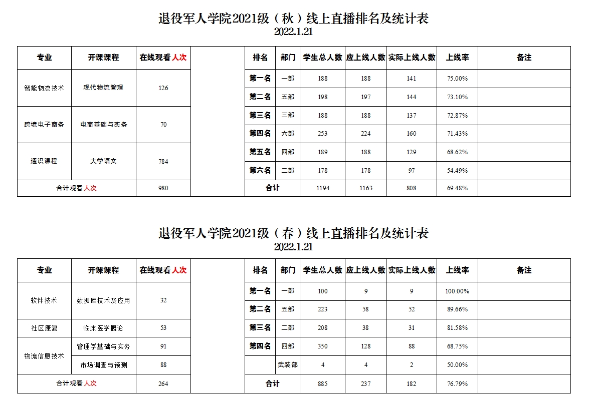 退役军人学院2021级、2022级线上直播排名及统计表(2022.1.21)