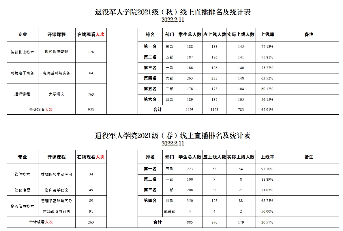 退役军人学院2021级、2022级线上直播排名及统计表(2022.2.11)