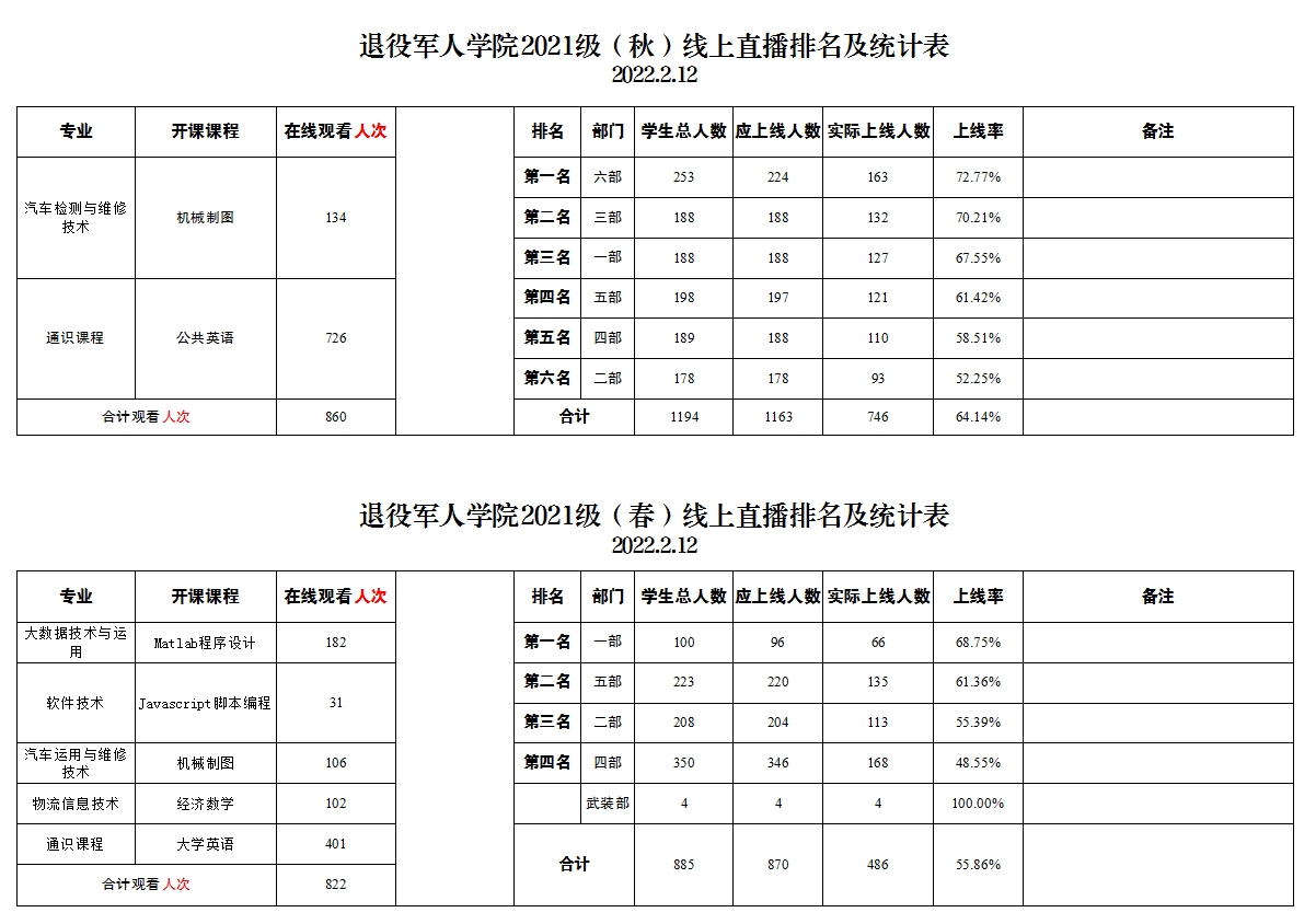 退役军人学院2021级、2022级线上直播排名及统计表(2022.2.12)