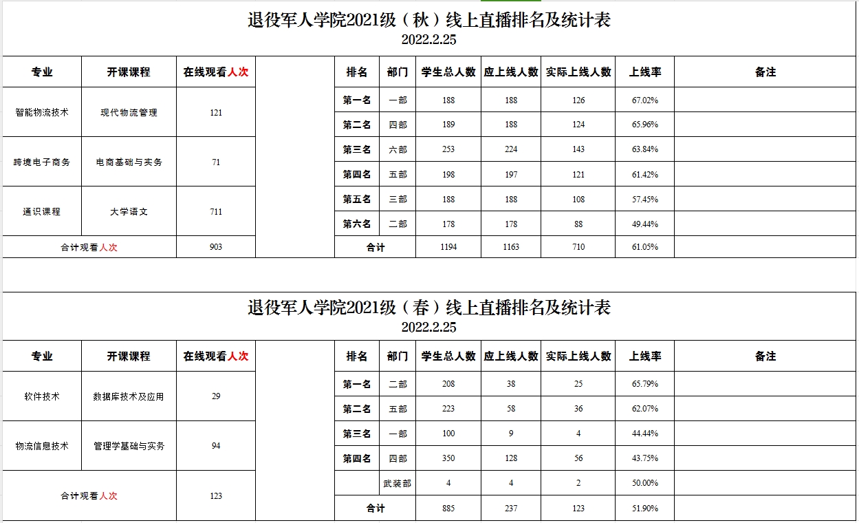 退役军人学院2021级、2022级线上直播排名及统计表(2022.2.25)