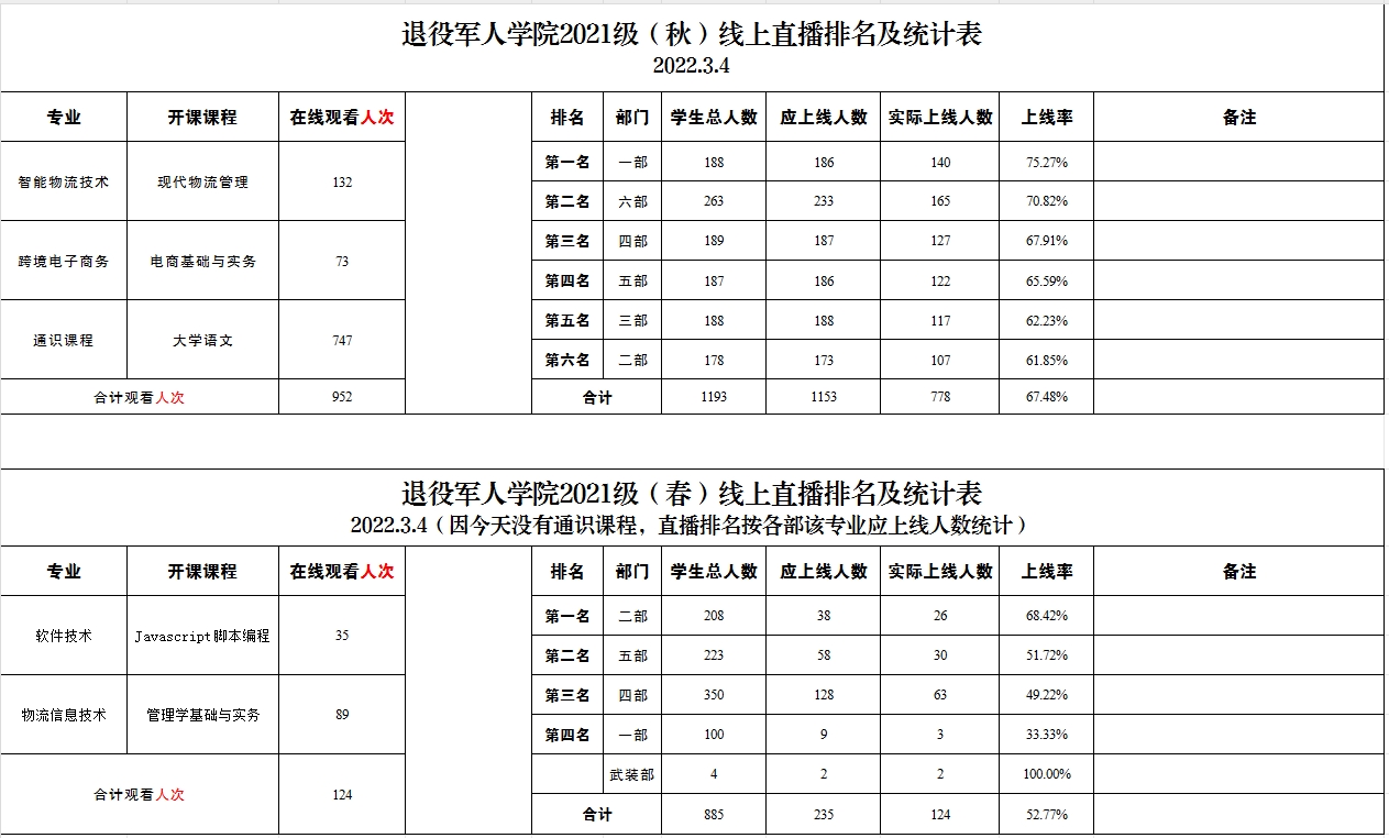 退役军人学院2021级、2022级线上直播排名及统计表(2022.3.4)