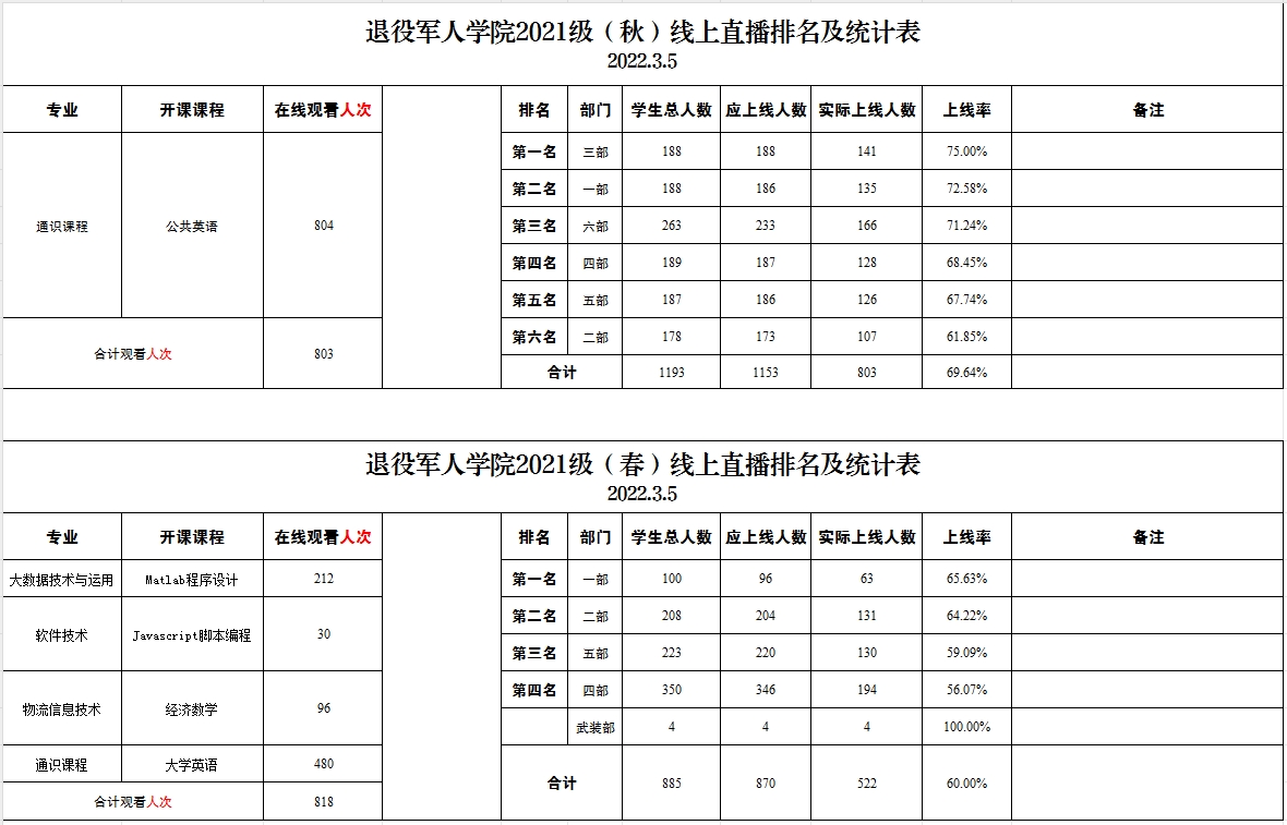 退役军人学院2021级、2022级线上直播排名及统计表(2022.3.5)