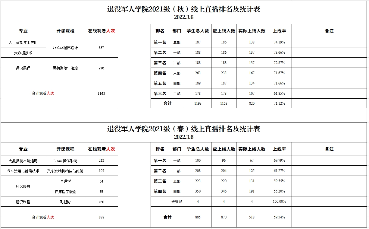 退役军人学院2021级、2022级线上直播排名及统计表(2022.3.6)