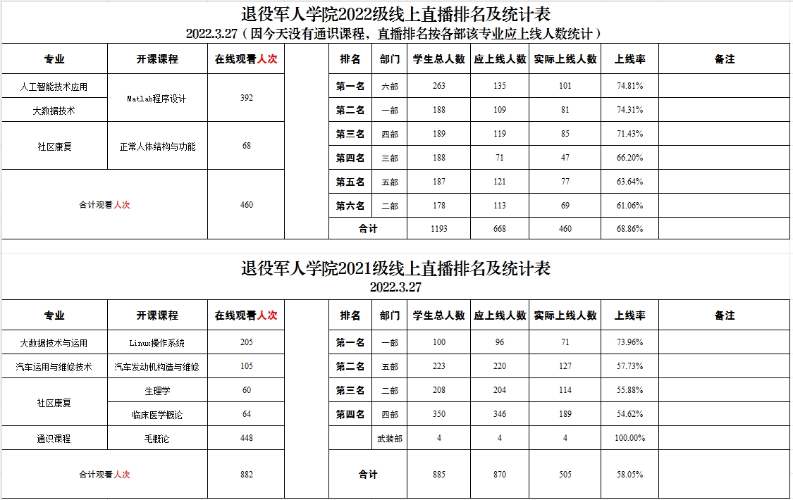 退役军人学院2021级、2022级线上直播排名及统计表(2022.3.27)