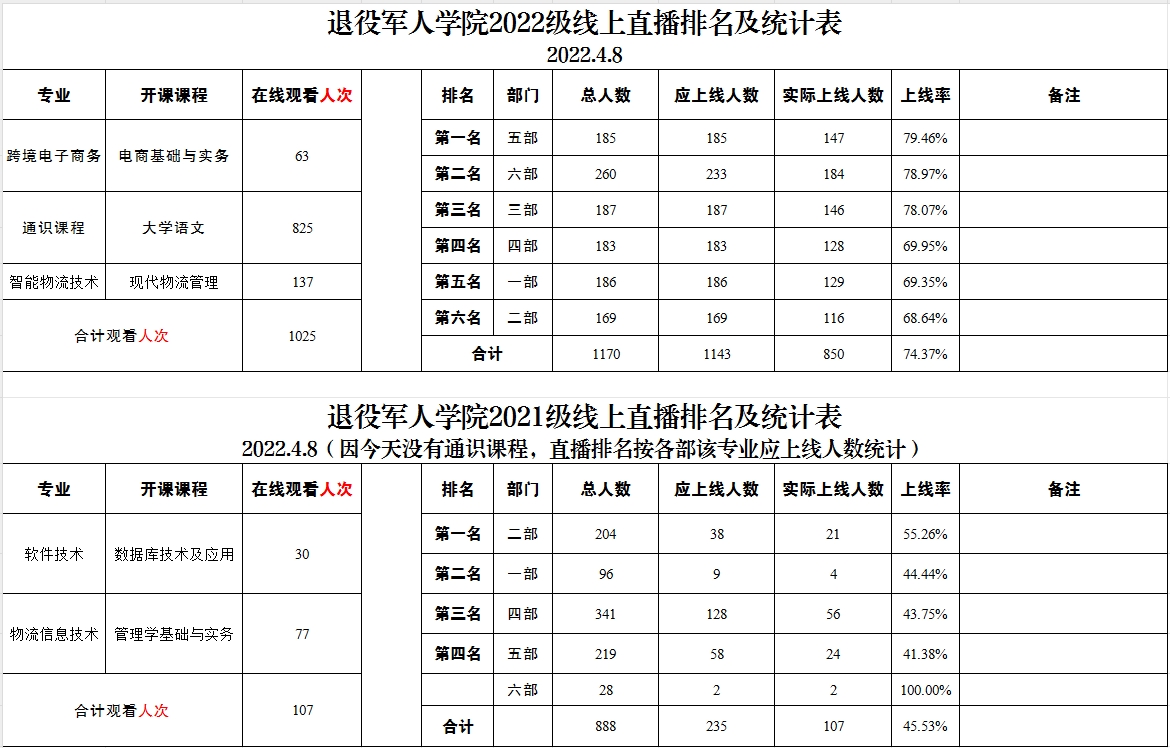 退役军人学院2021级、2022级线上直播排名及统计表(2022.4.8)