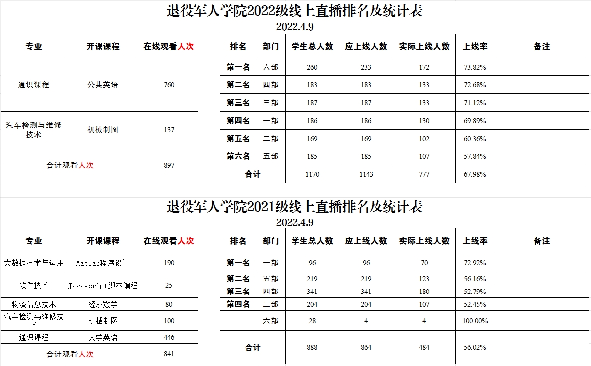 退役军人学院2021级、2022级线上直播排名及统计表(2022.4.9)
