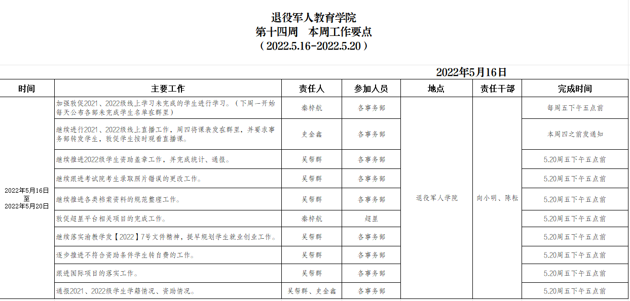 退役军人学院2022.5.16-5.20工作要点