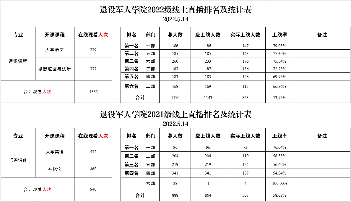 退役军人学院2021级、2022级线上直播排名及统计表(2022.5.14)