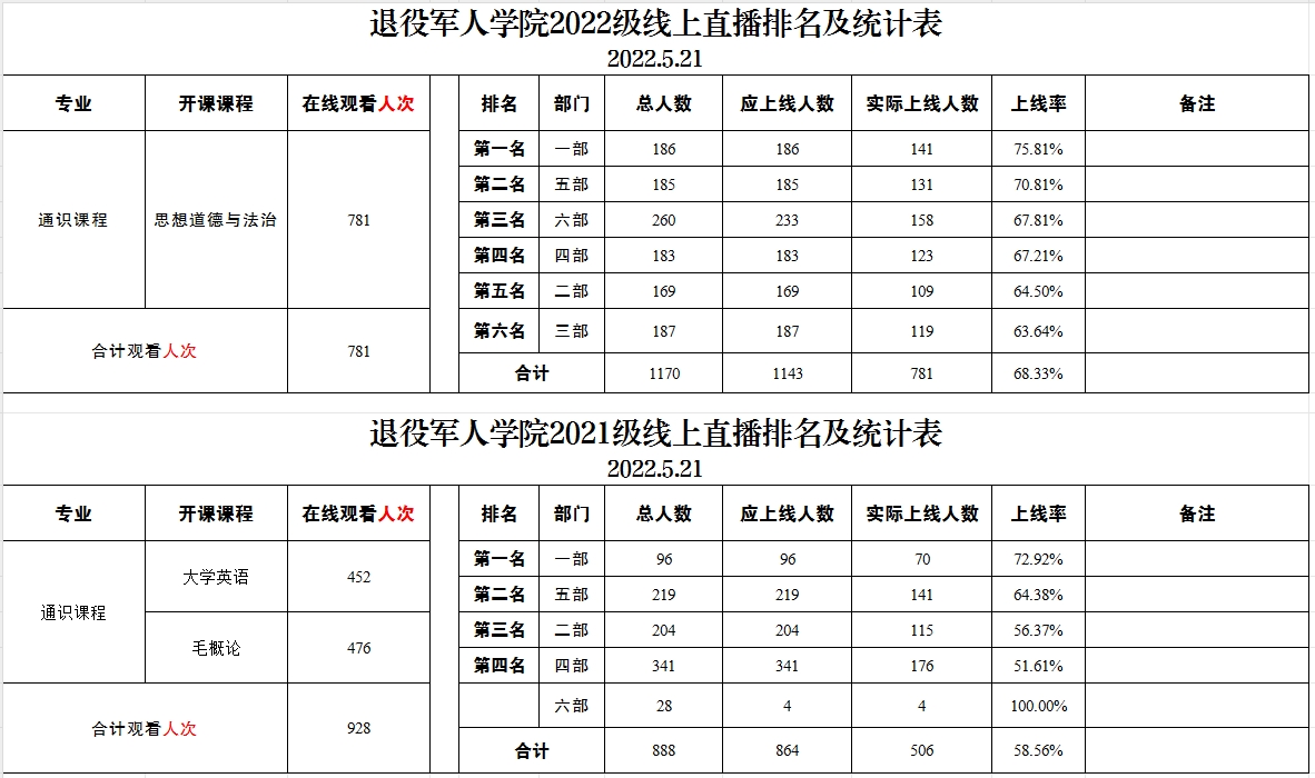 退役军人学院2021级、2022级线上直播排名及统计表(2022.5.21)