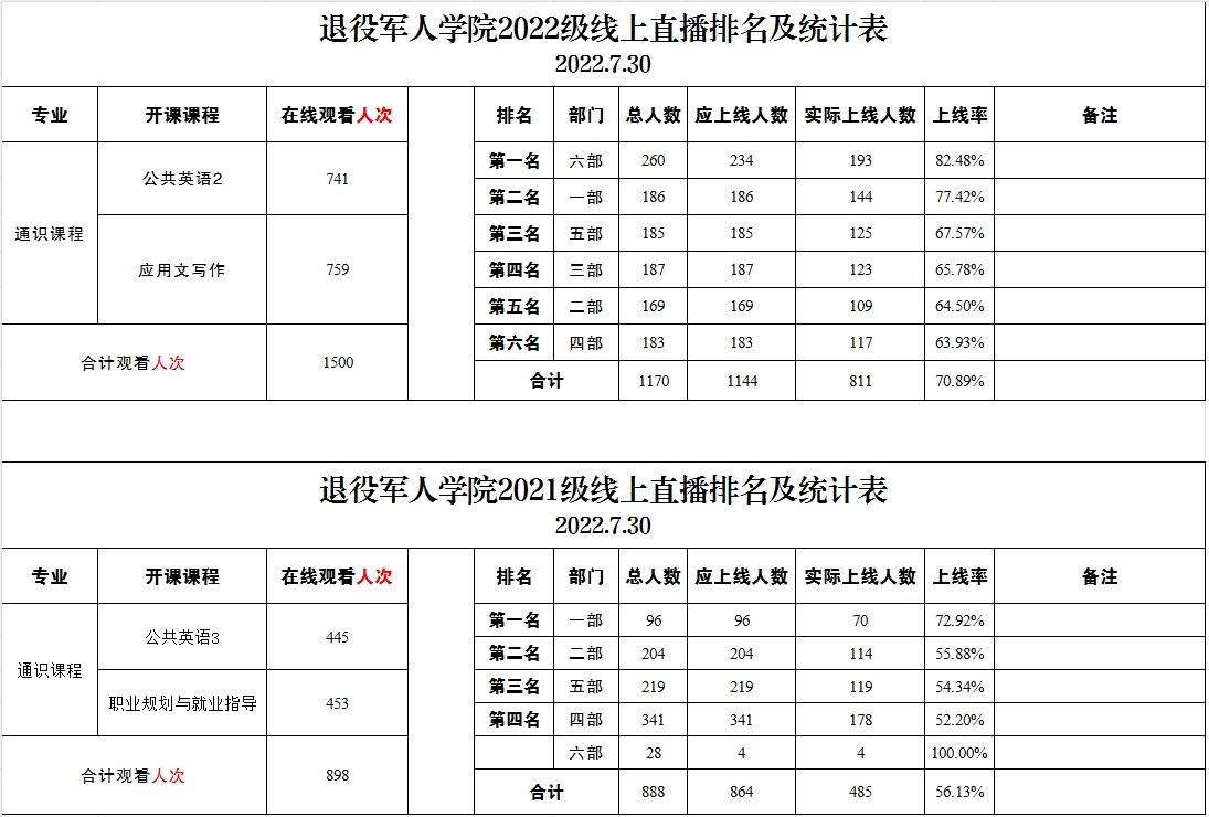 退役军人学院2021级、2022级线上直播排名及统计表(2022.7.30)