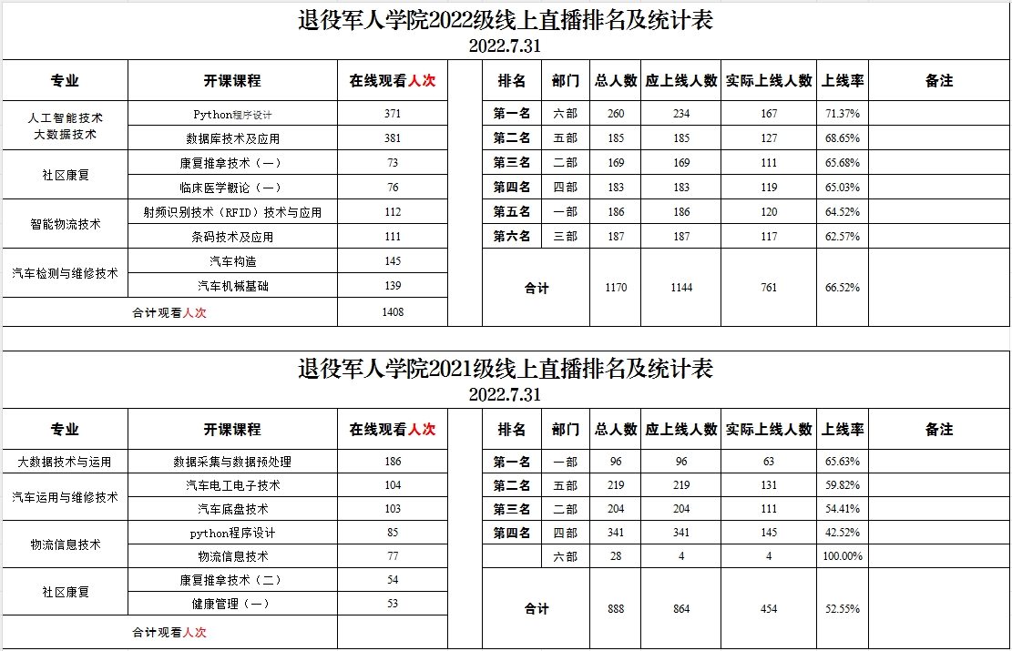 退役军人学院2021级、2022级线上直播排名及统计表(2022.7.31)