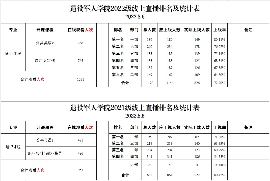 退役军人学院2021级、2022级线上直播排名及统计表(2022.8.6)