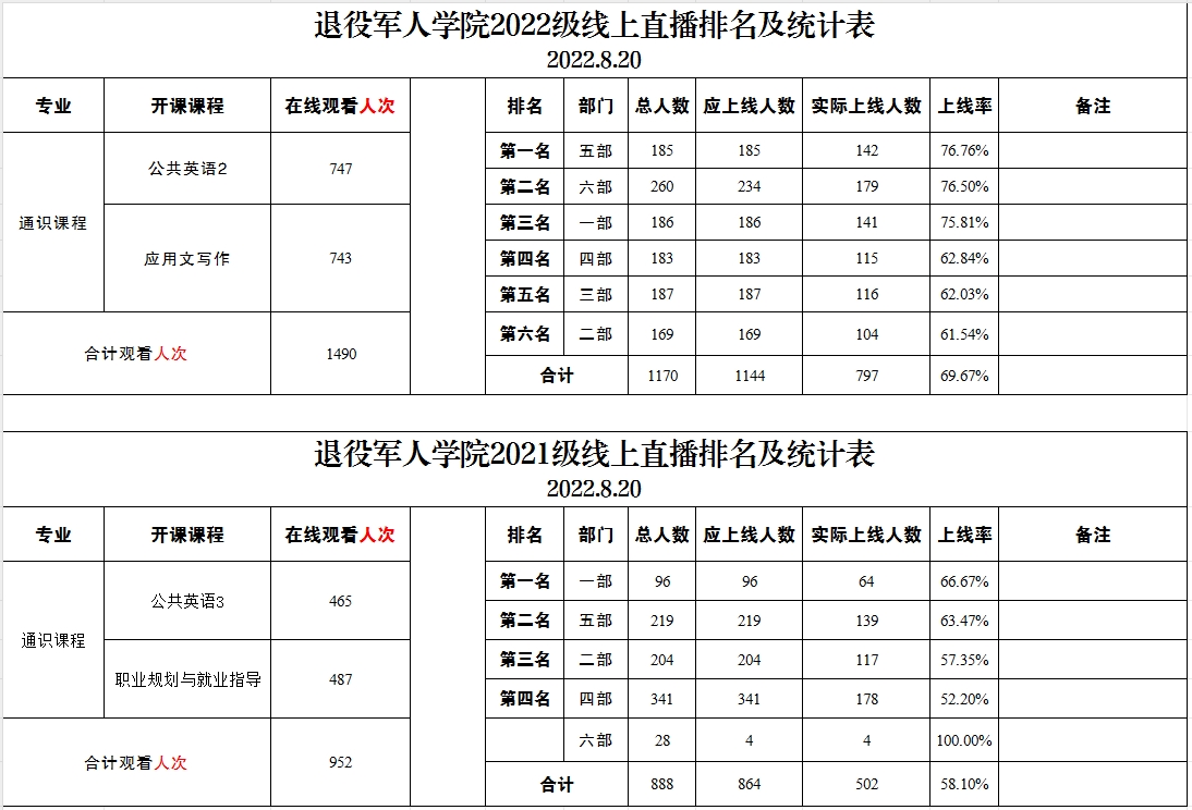 退役军人学院2021级、2022级线上直播排名及统计表(2022.8.20)