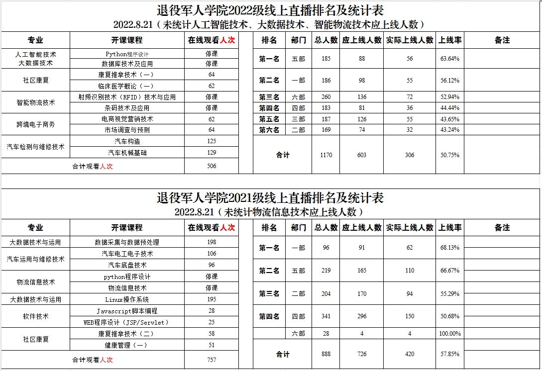 退役军人学院2021级、2022级线上直播排名及统计表(2022.8.21)