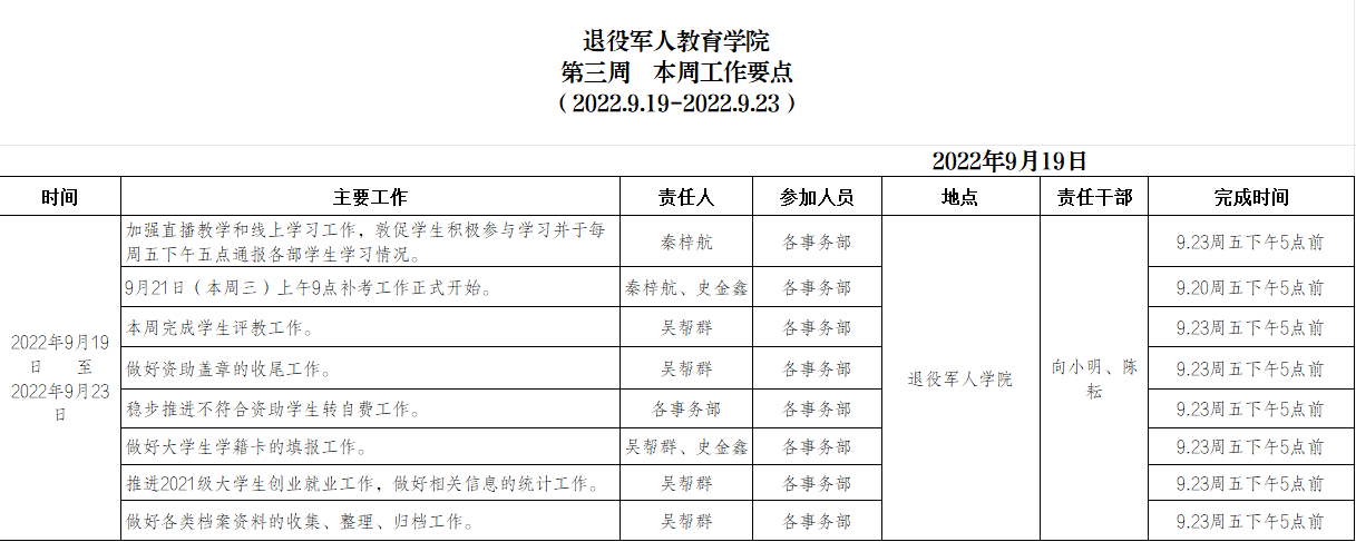 退役军人学院2022.9.19-9.23工作要点