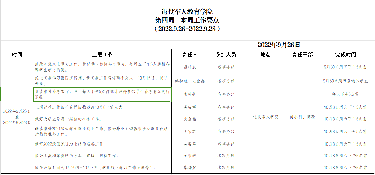 退役军人学院2022.9.26-9.28工作要点