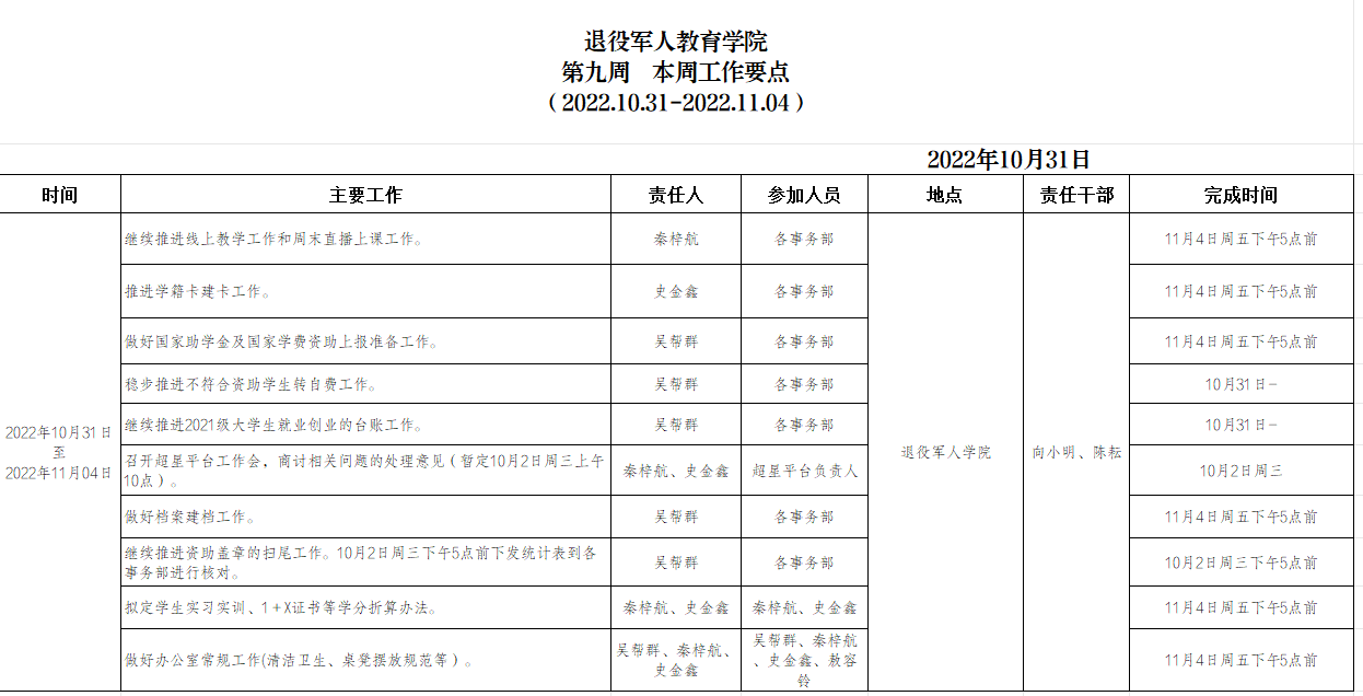 退役军人学院2022.10.31-11.04工作要点