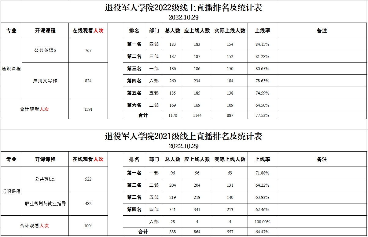 退役军人学院2021级、2022级线上直播排名及统计表(2022.10.29)