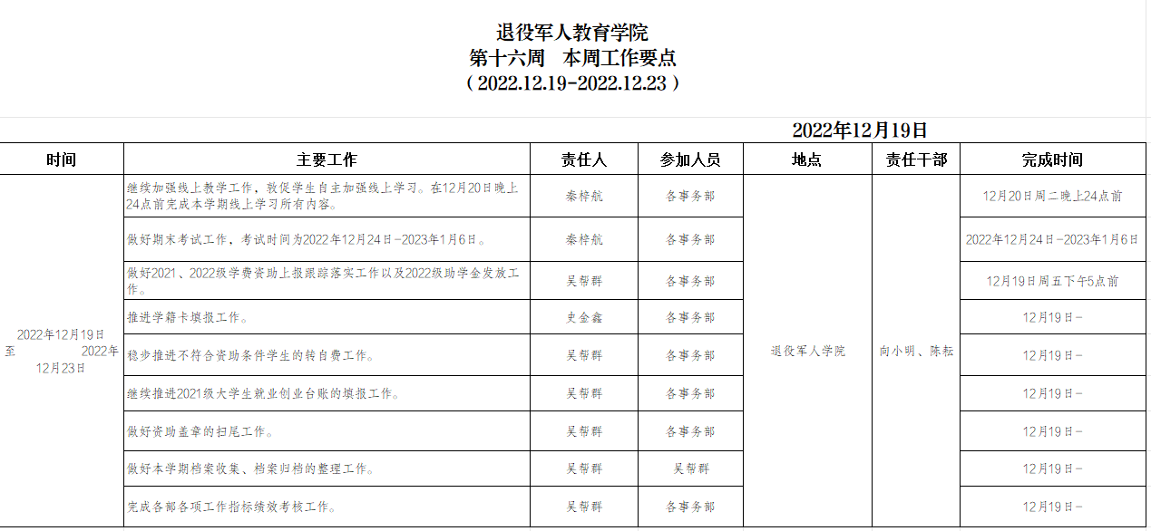 退役军人学院2022.12.19-12.23工作要点