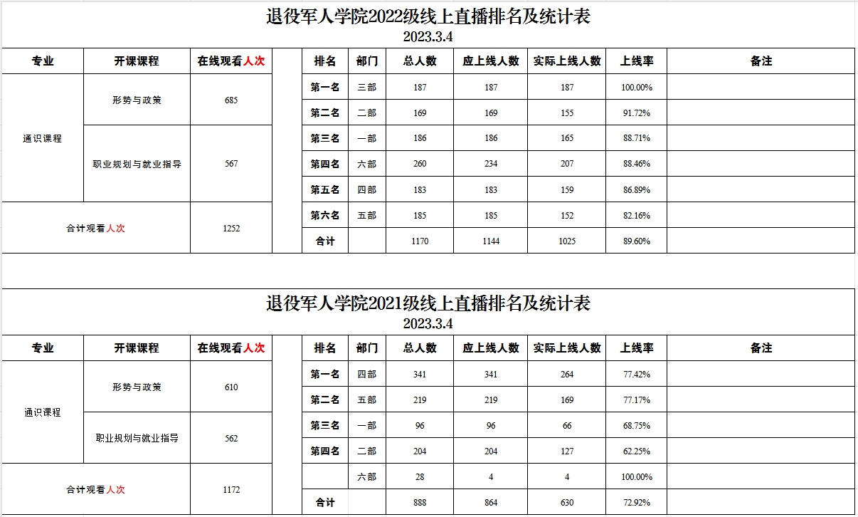 退役军人学院2021级、2022级线上直播排名及统计表(2023.3.4)