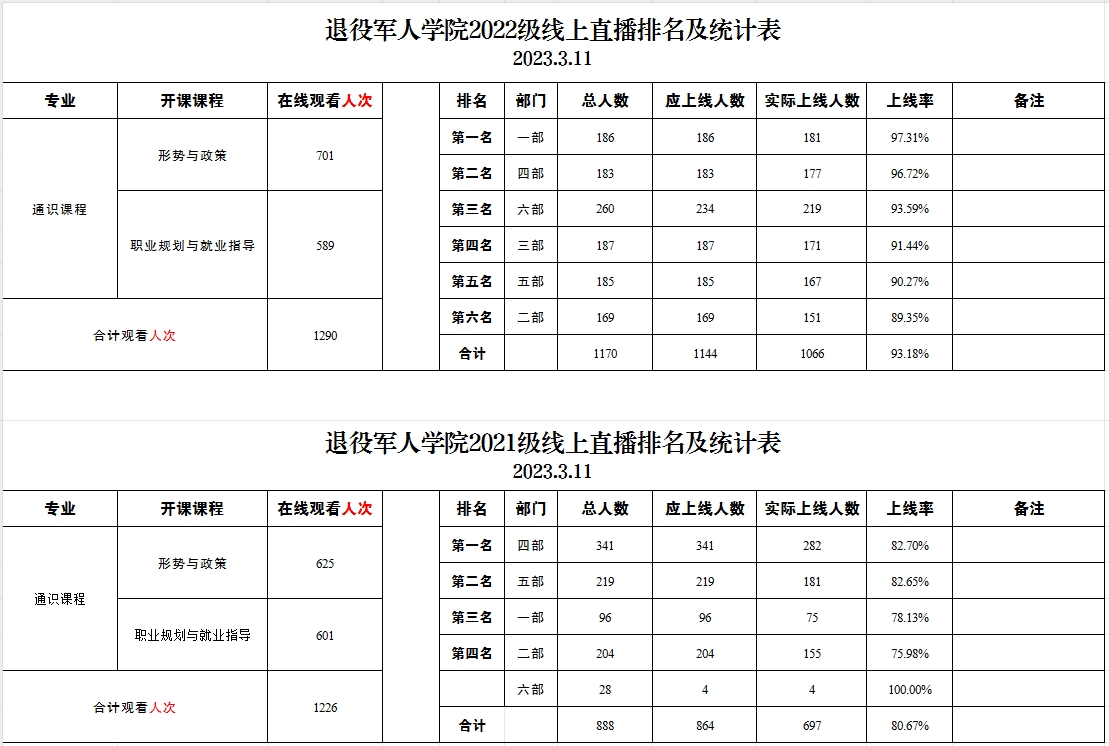 退役军人学院2021级、2022级线上直播排名及统计表(2023.3.11)