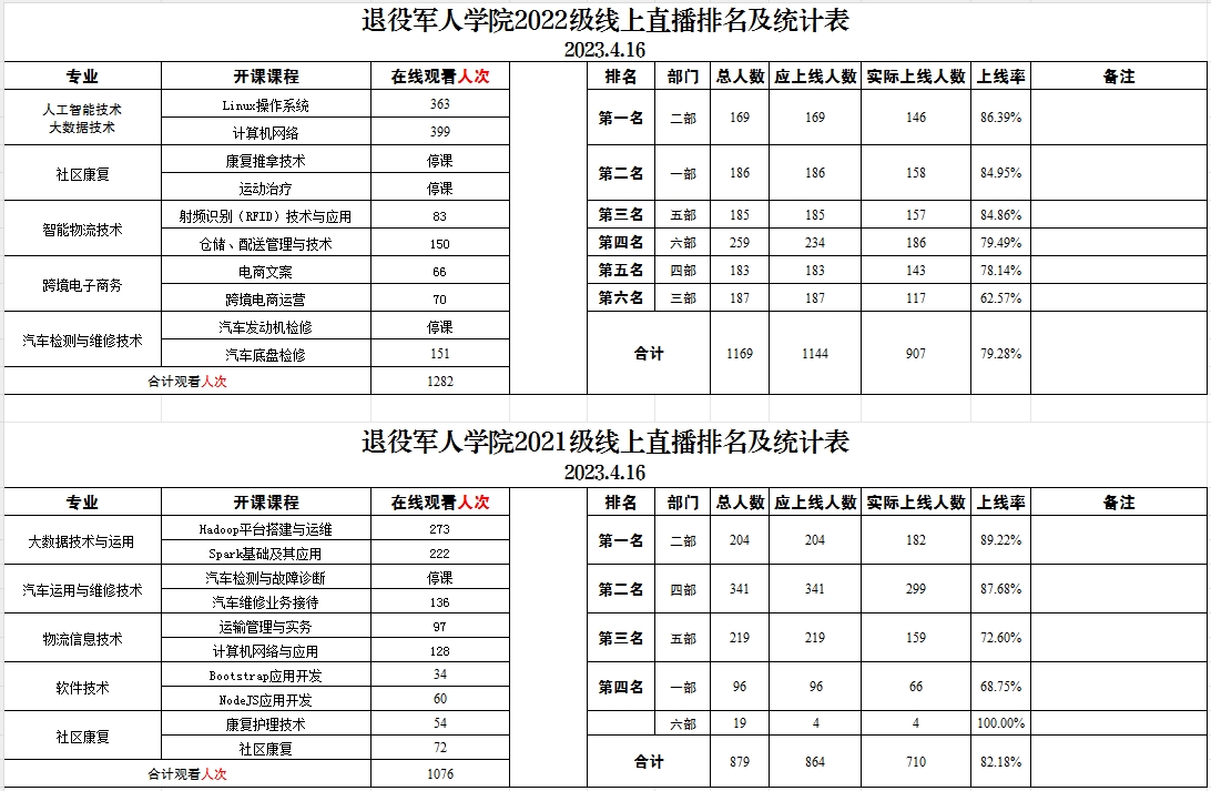 退役军人学院2021级、2022级线上直播排名及统计表(2023.4.16)