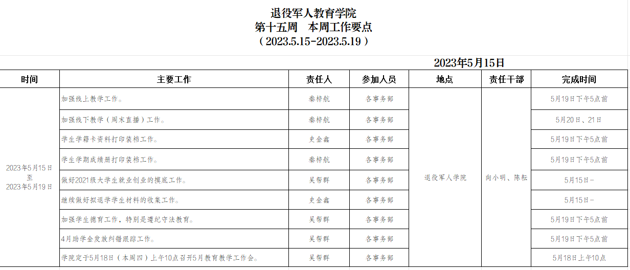 退役军人学院2023.5.15-5.19工作要点