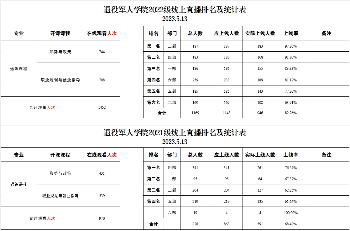 退役军人学院2021级、2022级线上直播排名及统计表(2023.5.13)