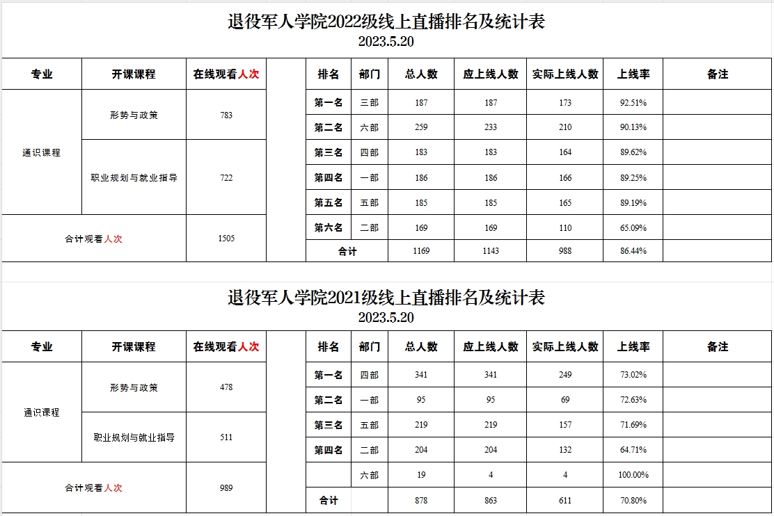 退役军人学院2021级、2022级线上直播排名及统计表(2023.5.20)