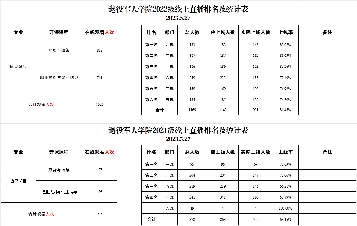 退役军人学院2021级、2022级线上直播排名及统计表(2023.5.27)