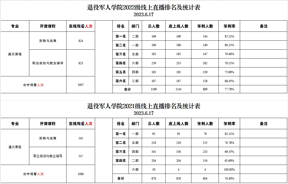 退役军人学院2021级、2022级线上直播排名及统计表(2023.6.17)