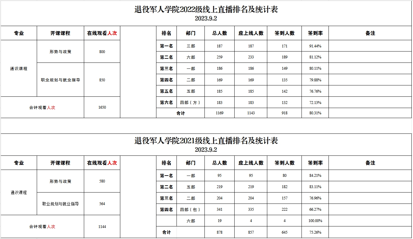 退役军人学院2021级、2022级线上直播排名及统计表(2023.9.2)