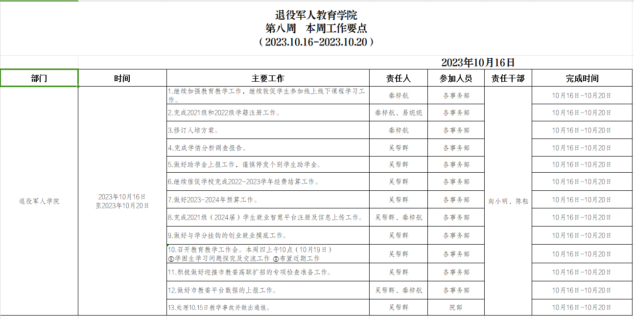 退役军人学院第八周工作要点