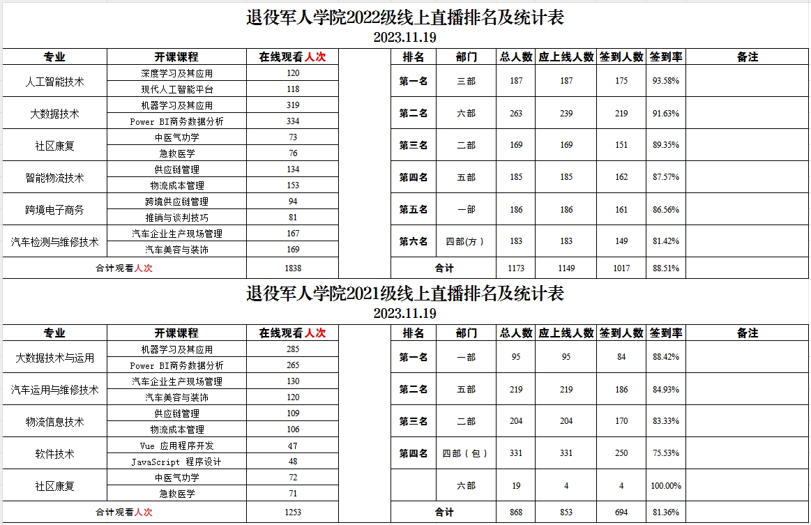 退役军人学院2021级、2022级线上直播排名及统计表(2023.11.19)