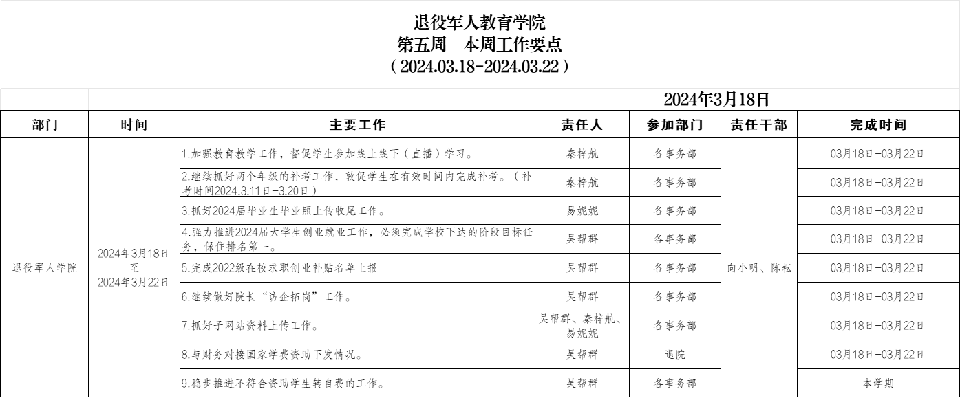 退役军人学院2024.3.18-3.22(第五周)工作要点