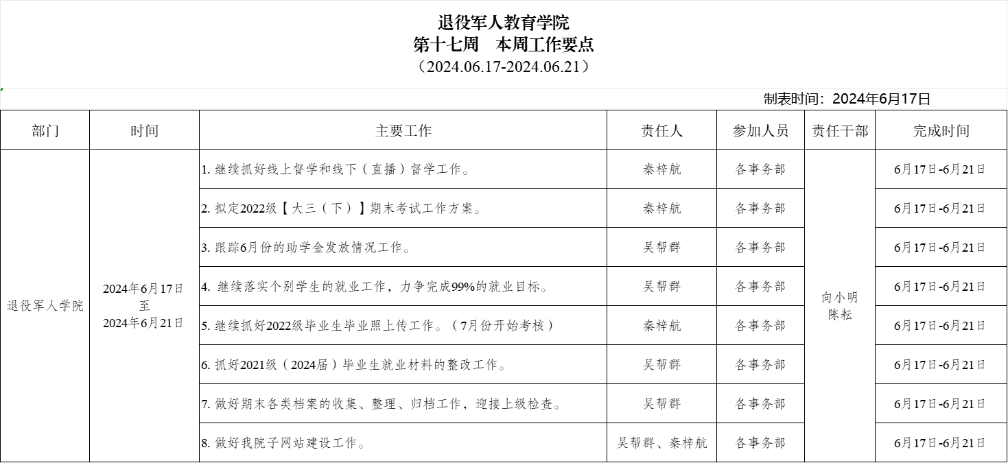 退役军人学院2024.6.17-6.21(第十七周)工作要点