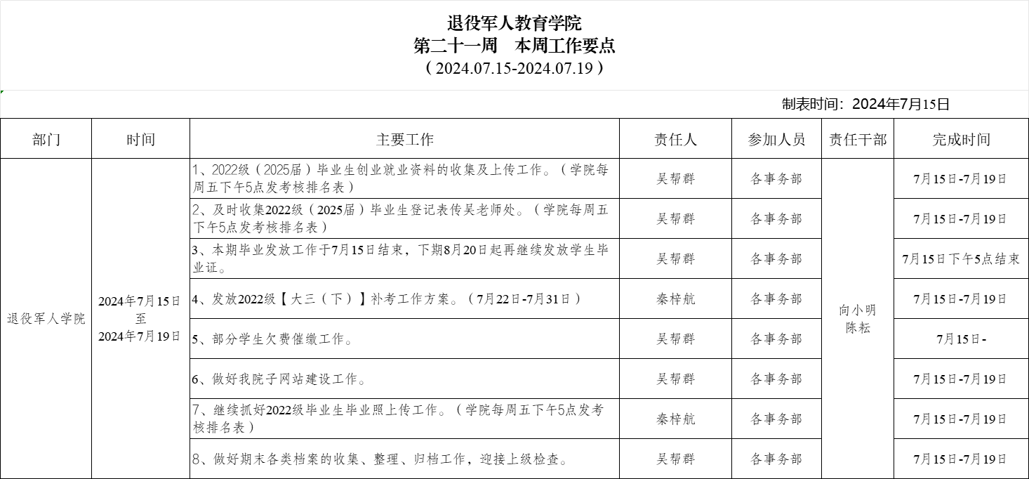 退役军人学院2024.7.15-7.19(第二十一周)工作要点