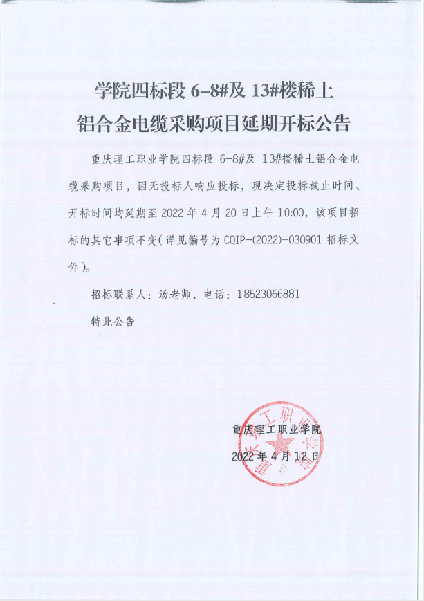 beat365英国官网网站四标段6-8#及13#楼稀土铝合金电缆采购延期开标公告