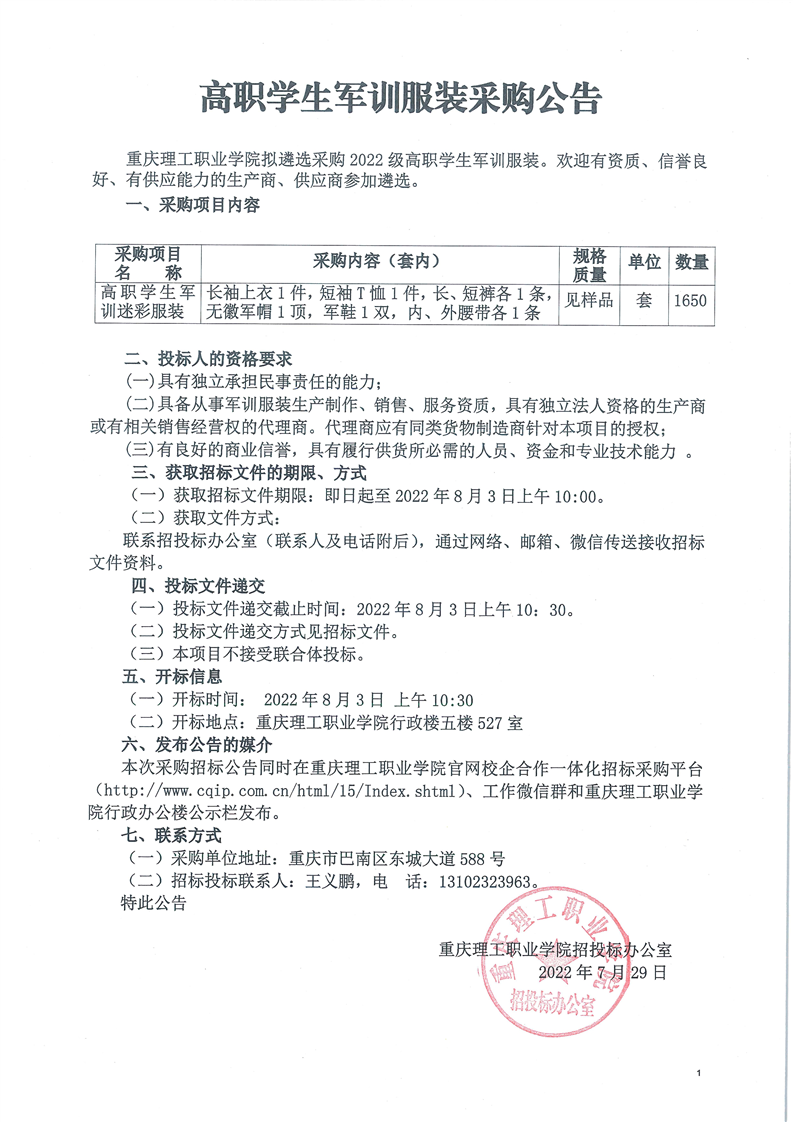 高职学生军训服装采购招标
