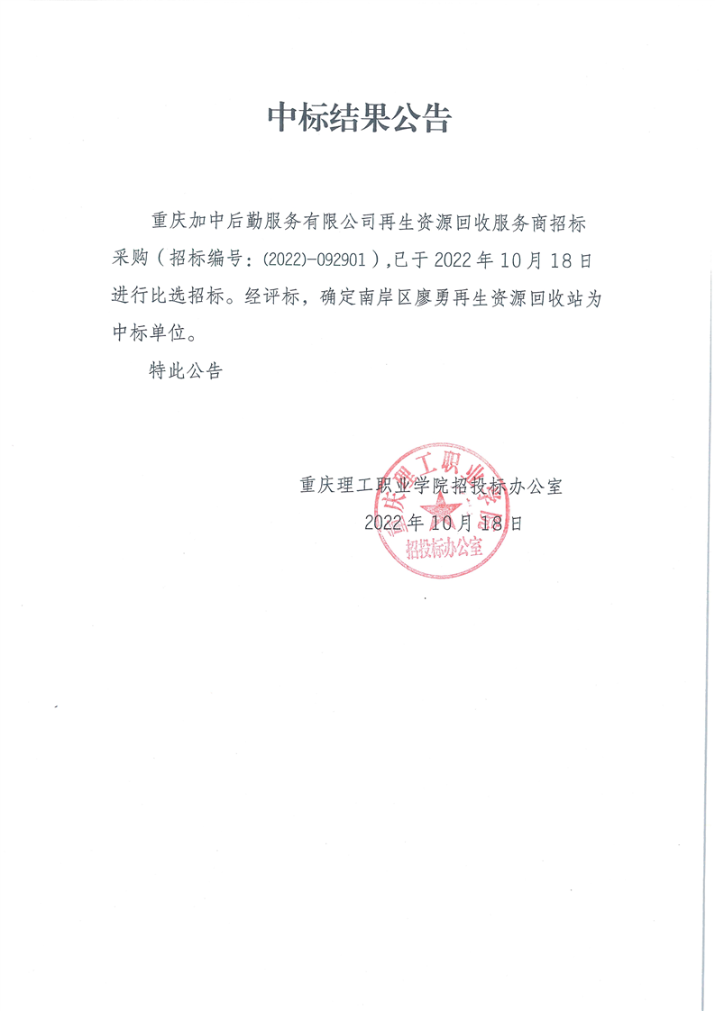 重庆加中后勤服务有限公司再生资源承包权中标结果公告