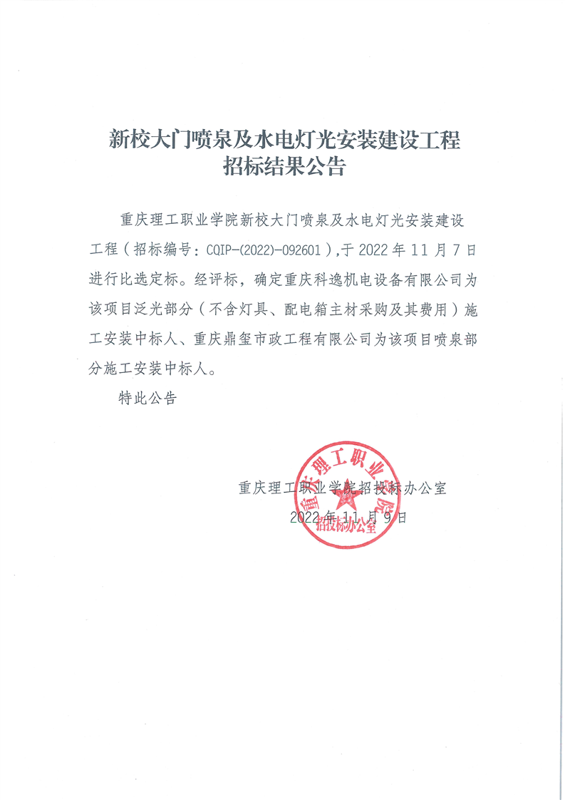 beat365英国官网网站新校大门喷泉及水电灯光安装建设工程招标结果公告