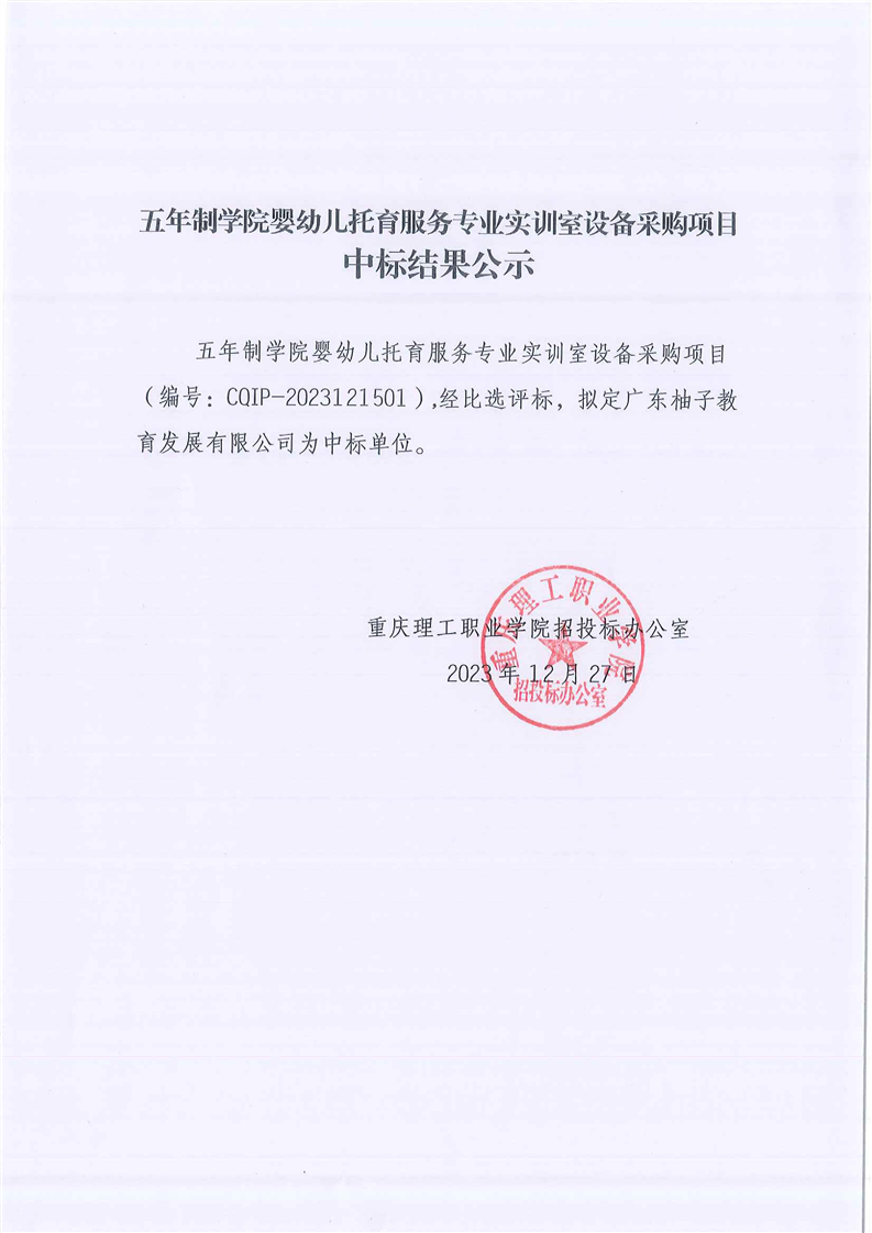 五年制学院婴幼儿托育服务专业实训室设备采购项目中标结果公告