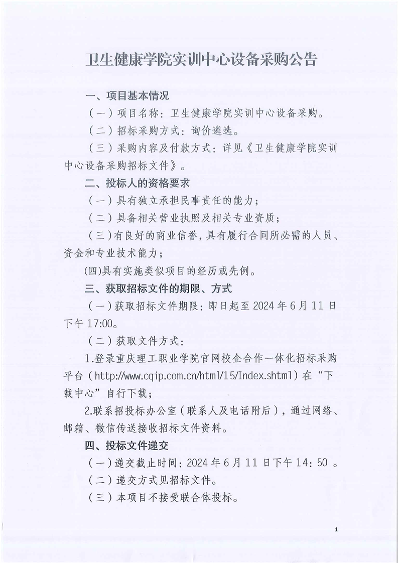 卫生健康学院实训中心设备采购公告
