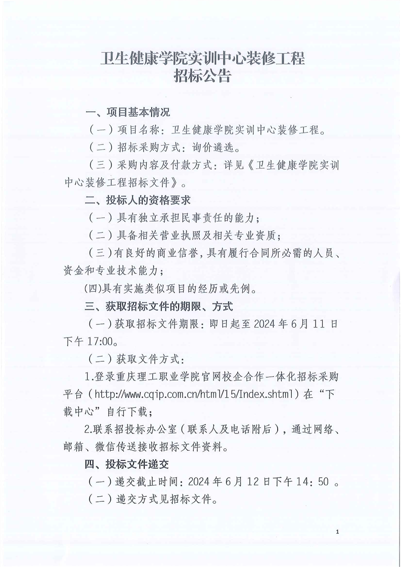 卫生健康学院实训中心装修工程招标公告